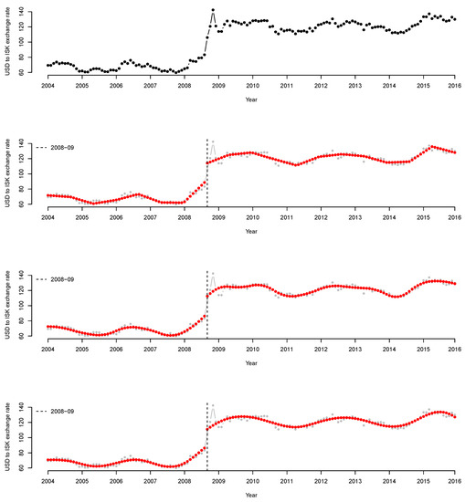 The data contained 144 sets of observations associated with the subprime mortgage crisis, which occurred between 2007 and 2008. This crisis refers to a series of economic crises that began with the bankruptcy of the largest mortgage lenders in the United States and caused a credit crunch not only in the United States, but also in the international financial market. One of affected countries was Iceland, whose three largest banks were affected by the crisis in September 2008. To revive the economy, the Icelandic government has implemented various policies, including the nationalization of banks. Consequently, the ISK exchange rate per USD increased. In Figure 6, the top panel shows the starting point for the data. In January 2004, the observed value is 69.345; in March 2008, the observed value increases gradually to 75.805 and then increases significantly to 105.965 in September. In the last observation, performed in December 2016, a continuous increase of the value is observed (129.960).