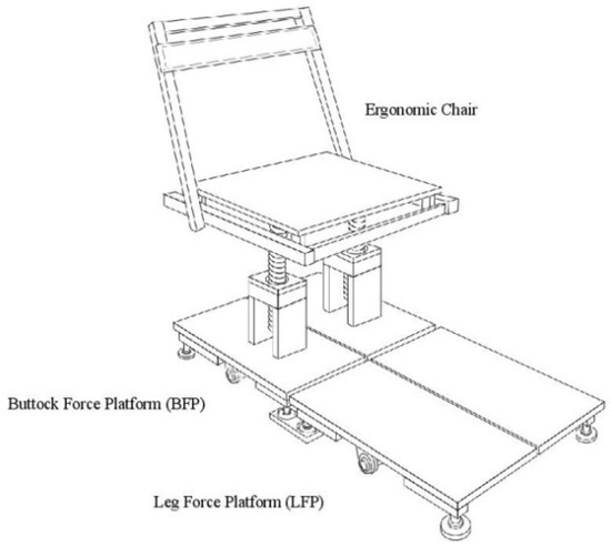 The key points underlying the performance of participants were recorded as a function of the force and time changes during the sit-to-stand movement on the force platform system. In this study, the ground reaction force was defined as the force applied to the ground or chair by the feet or buttocks, respectively. Vertical ground reaction forces were recorded from two separate force platforms (size, 500 mm × 500 mm; accuracy, 0.20 N) with each platform composed of four load cells. The distance between the force platforms was 10 mm (see the experimental apparatus in Figure 1). An experimental ergonomic chair was designed according to the specifications of the American National Standards Institute (ANSI) and the National Standards of the People’s Republic of China (GB). According to the ANSI, the angle of the seat plane and that between the seat plane and back were set to 4° and 100°, respectively. The depth and width of the seat were set to 40 and 45 cm, respectively. The height of the seat plane was adjustable between 32 and 46 cm (GB). A personal computer simultaneously saved the two sets of ground reaction force data at 1000 Hz using a 16 bit analog-to-digital converter acquisition board (NI PCI-6220; National Instruments) and dynamic amplifiers. Figure 1 shows the force platforms and ergonomic chair without armrests.