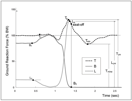 The force changes during the movement of the participant were measured using the force platform system, as shown in Figure 2. The horizontal axis shows the time course, while the vertical axis shows the ratio of the positive force measured by the force platform system to the weight of the participants (% body weight, BW). The two curves (Curve B, force on the hips; Curve L, force on the legs) obtained from the force platform system describe the ground reaction force (GRF) as a function of time, and Curve T is the sum of the force on the buttocks and legs (B + L). The profiles of Curves B (Bs), L (Ls), and T (Ts) were identified immediately after the action cue when the difference between the GRA at that timepoint and the previous value was not equal to zero. Tp and Lp occurred when the ground reaction force for Curves T and L, respectively, were maximal. Seat off was defined as the time at which the thighs lost contact with the chair, when the instant of Curve B was at zero (B0). The GRF oscillated following seat off, and Tmin represents the minimum body force during the ascending phase [36]. Tpw and Lpw are the maximum forces of Curves T and L, respectively.