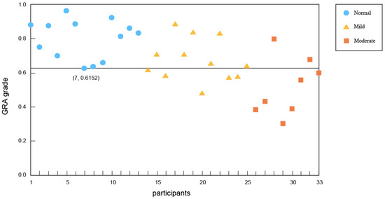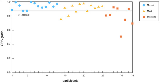 Using the force platform system, taking into account the GRA grade for the time factors and the weight factors with respect to the lower limit of children without intellectual disability, the sit-to-stand movement was measured to evaluate the balance of children with mild intellectual disability and moderate intellectual disability. The results revealed that the lower limit of the GRA grade for the time factor of children without intellectual disability was 0.8630, and the proportions of children with mild and moderate intellectual disability under this limit were 25% and 62.5%, respectively. The lower limit of the GRA grade for the weight factor of children without intellectual disability was 0.6153, and the proportions of the children with mild and moderate intellectual disability under this limit were 46.9% and 75%, respectively. The results show that, in terms of both the time factor and the weight factor, the proportion of children with intellectual disability who had lower performance than children without intellectual disability in the sit-to-stand movements tended to increase with the severity of intellectual disability. Figure 3 and Figure 4 show the GRA grade distribution diagrams of the time factor and weight factor of the participants.