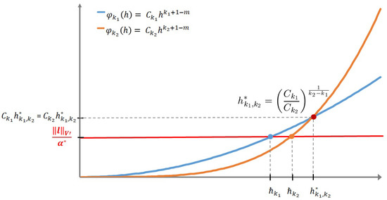 Therefore, in order to avoid this situation, for a given value of h, we consider two independent meshes built by a mesh generator for and . Now, usually, in order to compare the accuracy between these two finite elements, one asymptotically considers inequalities (19) and (20) to conclude that, when h proceeds to zero, is more accurate than , since proceeds faster to zero than .
