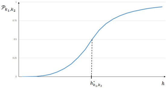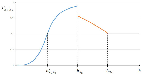 More precisely, if , then the probability such that is more likely accurate than will never be greater than 0.5 (see Figure 2), and if , then for the corresponding probability will decrease to the limit value of 0.5, even if it increases with values greater than 0.5 for h values between and (see Figure 3).