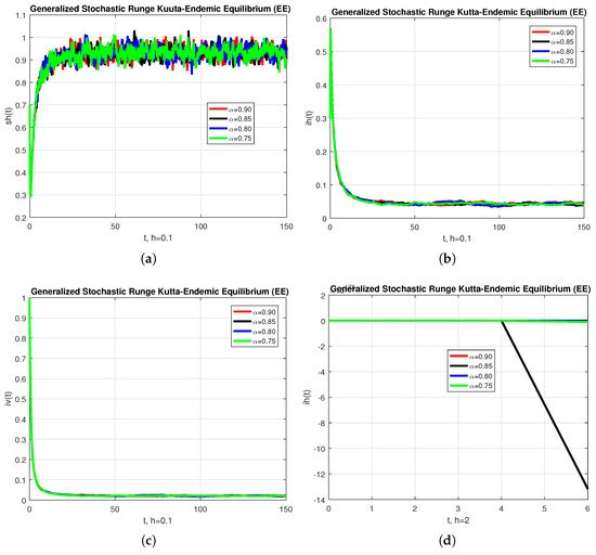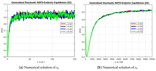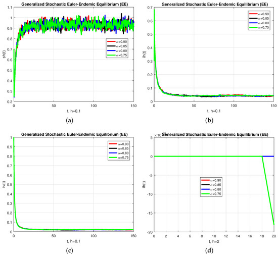 Before closing this section, we provide some numerical simulations for the stochastic fractional-order epidemic model (15). To that end, we fix the model parameters as given by Table 1 (see [26]). To start with, Figure 1 depicts the convergence behavior of each compartment of the model at the endemic equilibrium (EE). The behavior of the graphs is investigated for various values of . Each graph adopts a random path to reach the EE at the temporal step-size . When the step-size is increased, the infected population may diverge at each value of the non-integer parameter. We conclude from this that the generalized stochastic Euler method fails to illustrate the actual behavior of the disease dynamics.