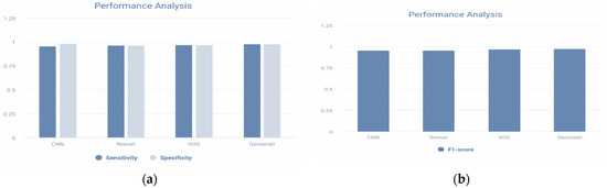 (a) Sensitivity, specificity vs. models. (b) F1-score vs. models.