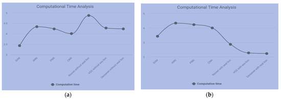The experimental findings highlight the efficiency of our suggested technique to address more segmentation challenges by boosting segmentation quality and precision within a minimum period. Table 13 shows a greater precision, sensitivity, and specificity of the sea-lion-based CNN classifiers; the error value is less than the suggested classifier. The results show that the suggested method performs quite well. The implementation of the proposed tumor detection approach has been shown to enhance the effectiveness and precision of clinical practice. The time analyses of several deep models are shown in Table 10. Table 13 represents the overall model analysis with regard to computational time. The precision of different models is illustrated in Figure 9a,b which exhibits the error of different models in which DenseNet has less error and more accuracy. Figure 10a illustrates the sensitivity and specificity of different models, and Figure 10b displays the F1 score with regard to different models in which DenseNet offers greater performance than the alternatives with sea lion optimization. Figure 11a shows several models without sea lion, and Figure 11b shows different models with sea lion, in which this calculation is reduced on a particular level when optimized.