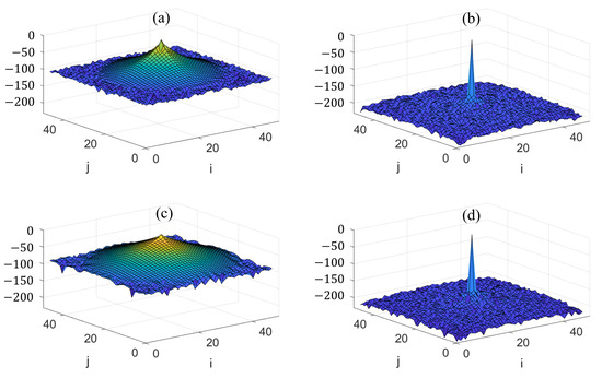 To further illustrate the divergence property of various implicit FDTD methods, let us consider a simple cavity of PEC walls meshed with uniform grids. With the source being impressed at the cavity center, we implement the methods for various ( is the CFL limit time step size) and calculate the normalized numerical divergence of in dB. Figure 1 shows the normalized numerical divergence of in the source plane using (a) time-collocated/leapfrog ADI FDTD for ; (b) leapfrog CDI FDTD for ; (c) time-collocated/leapfrog ADI FDTD for ; (d) leapfrog CDI FDTD for . From Figure 1a,b for , we see that the ADI FDTD method is not divergence-free even outside the source point. On the other hand, the leapfrog CDI FDTD method has divergence only at the source point while its divergence outside is mostly of numerical noise level (∼−200 dB). For in Figure 1c,d, one can see that the ADI FDTD method has larger spread of non-zero divergence outside the source point, whereas the leapfrog CDI FDTD method still has complying divergence everywhere.
