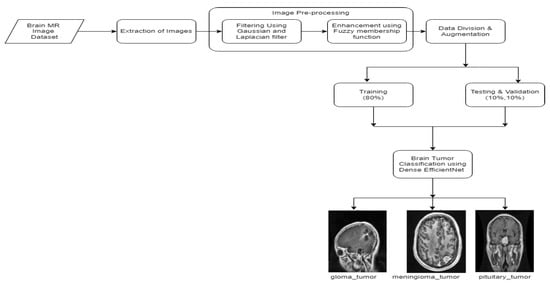 In this paper, the authors have applied min-max normalization and data augmentation techniques on a large dataset of 3260 different types of brain MRI images []. The image database includes 3064 T1-weighted contrast-enhanced MRI images collected from Kaggle.com. These are mainly three kinds of brain tumors: one is meningioma which contains 708 pictures; the second is glioma which contains 1426 pictures; and lastly there is pituitary tumor which contains 930 pictures. All pictures were collected from 233 patients in three planes: sagittal (1025 photos), axial (994 photos), and coronal (1045 photos). The authors divided the dataset into three distinct parts for training, validation, and testing. The suggested model is composed of different stages which are illustrated in Figure 1.