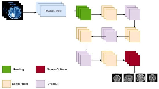 A novel dense CNN model is presented in this article, which is a mix of pre-trained EfficientNetB0 with dense layers. EfficientB0 has 230 layers and 7 MBConv blocks [,]. It features a thick block structure consisting of four tightly linked layers with a development rate of 4. Each layer in this structure uses the output feature maps of the preceding levels as the input feature maps. The dense block concept is composed of convolution layers of the same size as the input feature maps in EfficientNet. Dense block takes advantage of the preceding convolution layers’ output feature maps to generate more feature maps with fewer convolution kernels. This CNN model retrieved 150 × 150 enhanced MRI image data. The dense EfficientNet network has an alternate dense and drop-out layer. A dense layer is the basic layer which feeds all outputs from the previous layer to all its neurons, each neuron providing one output to the next layer. The drop-out layer is used to reduce the capacity or thin the network during training and avoids the overfitting. We begin by adding a pooling layer, followed by four dense layers and three drop-out layers to ensure the model runs smoothly. The numbers of neurons in the dense units are 720, 360, 360, and 180, respectively. The drop-out values are 0.25, 0.25, and 0.5, respectively. Finally, the authors have used a dense layer composed of four fully connected neurons in conjunction with a Softmax output layer to compute and classify the probability score for each class. Figure 4 illustrates the structure of the proposed EfficientNet in detail.