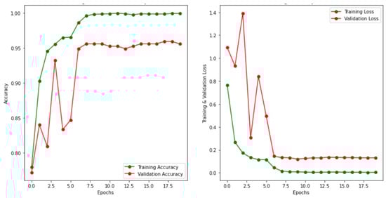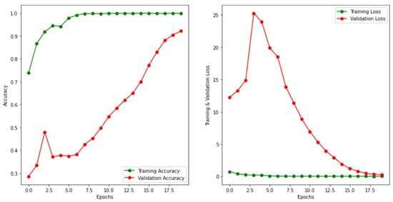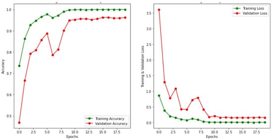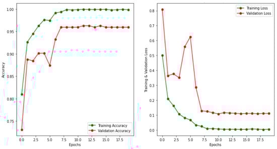 The experiment has been performed in 20 epochs. A batch size of 32, image size 150, and verbose 1 have been considered for the experiment. In the accuracy model, initial validation accuracy is below 0.75 but after one epoch the validation accuracy suddenly increases to nearly 0.88. In the same manner, the initial validation loss is above 0.8 but after one epoch the loss decreases below 0.4. As shown in Figure 5, there is a positive trend toward improving accuracy and reducing loss. At first, validation accuracy is low, but it progressively improves to almost 97.5 percent. The succeeding part of the measure was accomplished on the ResNet50 model, MobileNet, and the MobileNetV2 model, which are shown in Figure 6, Figure 7, and Figure 8, respectively.