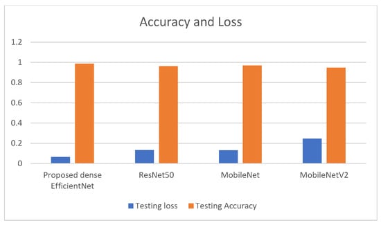 From the above model accuracy and model loss graphs, the authors concluded that in the case of the mobile net case, the graph is disordered, and the difference between loss and accuracy is very high. So, the accuracy value of MobileNetV2 is lower than the others. The accuracy and loss graphs of dense EfficientNet, ResNet, and MobileNet are almost nearly equal. The testing accuracy and testing loss of dense EfficientNet is 98.78% and 0.0645, respectively, whereas the accuracy and loss in the case of MobileNetV2 is 96.94% and 0.2452, respectively. The testing accuracy acquired using the MobileNet model is 96.94% and the test loss is 0.1339 whereas the accuracy and loss value of ResNet is just less than MobileNet. The detailed comparison of test accuracy, as well as loss of different models, is shown in Table 1, and performance analysis is shown in Figure 9.