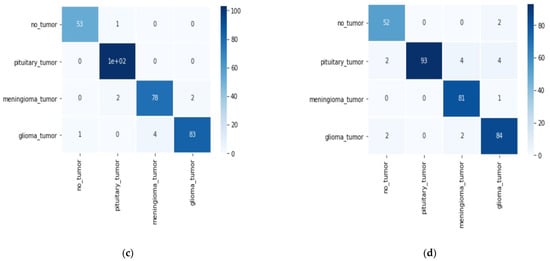 Confusion matrix of: (a) proposed dense EfficientNet model; (b) ResNet50 model; (c) MobileNet model; (d) MobileNetV2 model.