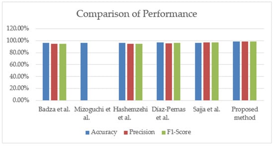 It is observed from Table 2 and the analysis graph in Figure 11 that dense EfficientNet has the highest precision, recall, and F1-score when compared to the other three models. The pituitary tumor has the best performance in all measurements when compared to other types of tumors. All the values of precision, recall, and F1-score of pituitary tumors are quite good. The overall results of dense EfficientNet are excellent. For comparison purposes, the authors have also considered the recent performance of modified CNN structure by the different researchers, which is shown in Table 3 analysis and is displayed in Figure 12. The accuracy, precision, and F1-score of the proposed method are 98.78%, 98.75%, and 98.75%, respectively, which is better than other comparison methods. As shown in Table 3, the proposed deep learning segmentation algorithm outperforms state-of-the-art techniques. Based on Table 3, the authors conclude that dense EfficientNet outperforms other techniques because deep-learning-based approaches are more efficient and capable of handling large amounts of data for classification.