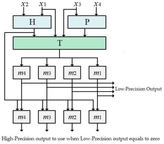 This section presents the full adder-based and memory-free hardware design of the proposed RNS scaler. The overview of the proposed approach for a generic four-moduli set is depicted in Figure 1. First, P, H and T are computed using Equations (15)–(17), and then, the two-moduli scaled residues are computed using Equation (21). Afterward, the single-modulo scaled residues are obtained using the precomputed two-moduli scaled residues based on Equation (27). The important part of the scaler is the calculation of T that is shared between both kinds of scaling, resulting in a significant hardware reduction.