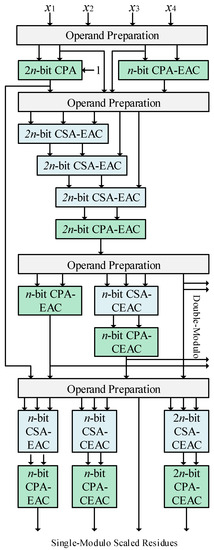 The operand preparation unit performs the required inversions, shifting and multiplexing needed in Equation (41). Then, the important variable T in Equation (42) can be realized using three carry-save adders (CSAs) with EAC followed by a modulo 22n − 1 CPA [18]. Then, according to Equations (49)–(52), the first and second two-moduli scaled residues are equal to T, and the third and fourth are only the reduction of T in moduli 2n − 1 and 2n + 1, which can be realized using an n-bit CPA with EAC and n-bit CPA with complement EAC (CEAC), respectively. Note that CPA-CEAC is a representation of the modulo 2n + 1 adder which can be realized using different methods [19]. Finally, the single-modulo scaled residues can be achieved using Equations (54)–(57). The CSAs are used to compress the three operands into two, and then a modulo adder produces the scaled residue. It can be seen that in the customized version of the scaler for the moduli set {22n + 1, 22n, 2n + 1, 2n − 1}, the units for m1 and m2 reduction in the two-moduli scaling part are removed, since the scaled residues are equal to T. Aside from that, the second single-modulo scaled residue is H, and hence, the required m2 reduction unit is removed.