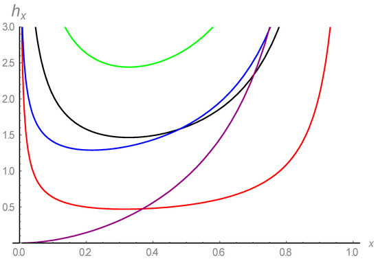 Figure 2. Plots of 3PB HRF: α = 0.2, β = 0.1, δ = 2 (red), α = 0.6, β = 0.2, δ = 1 (black), α = 0.7, β = 0.9, δ = 1 (blue), α = 1, β = 2.2, δ = 1.3 (purple), α = 1, β = 0.2, δ = 1 (green).