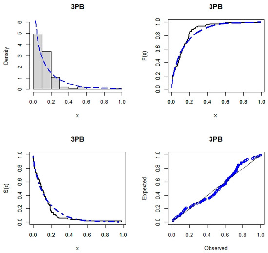 The 3PB distribution is compared with other distributions, such as beta (B), log-Lindley (LL) [15], power log-Lindley (PLL) [16], power logarithmic (PL) [17], reduced Kies (RK) [18], log-gamma (LG) [19], log-weighted power (LWP) [20], transmuted power (TP) [20], and Kumaraswamy (K) distributions.