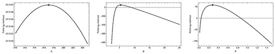 Figure 11. Behavior of log-likelihood function with 3PB model parameters for the stress-rupture data set.