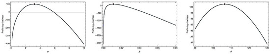 Figure 6 and Figure 7 show the estimated PDF, CDF, and SF of 3PD distribution with P-P plots for burr and stress-rupture data sets, respectively. Figure 8 and Figure 9 illustrate, burr and stress-rupture data sets, respectively, the existence and uniqueness of estimated parameters of 3PB model. Figure 10 and Figure 11 show the behavior of the estimated log-likelihood function for burr and stress-rupture data sets, respectively.