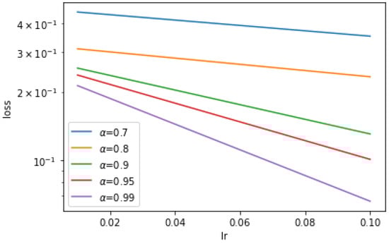 In the neural network training experiment based on the TFGD algorithm, each set of data on the basis of 500 iterations will be repeatedly run 20 times for training. Then, we take the average loss of 20 times of repeated experiments when the loss of each iteration is the lowest. We obtain the obvious loss effects of the neural network associated with different , when the learning rate  is taken as 0.01 or 0.1, respectively. The experiment result is shown in Figure 1.