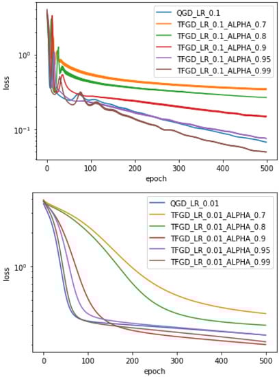 Comparison of loss effects for the learning rates  and , and the fractional order parameters , where QGD and TFGD stand for the general gradient descent and the time-fractional gradient descent, respectively.