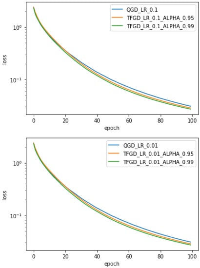 In a word, under the condition of selecting the appropriate learning rate, if the value of  is larger, the loss effect of the TFGD is better. This verifies that the memory dependence has an impact on the training of neural networks.