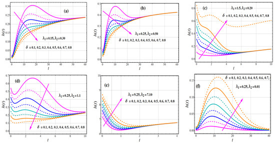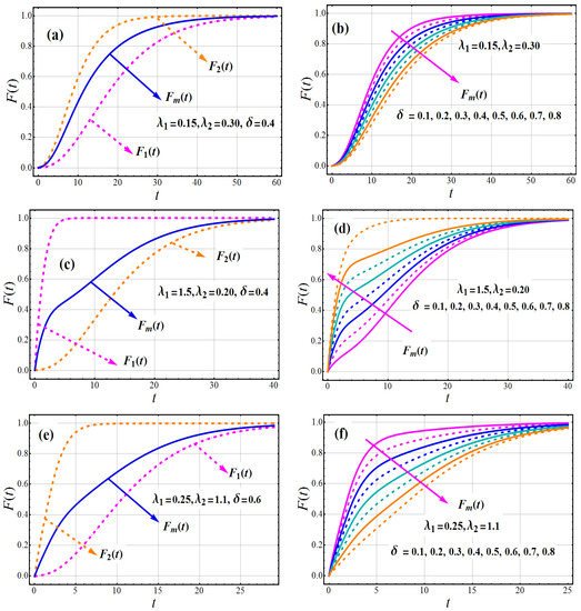In Figure 8, the HRF of TC-MAM shows monotonically increasing, modified decreasing, decreasing–increasing–decreasing (DID), decreasing–increasing (DI), and upside down bathtub behavior. Figure 8a,b,d signifies that the reduction in failure rate function profile and is noted by enlarging the value of mixing parameter and for . Figure 8c,e,f exhibits the diversion in the failure rate function for various values of . It is found in Figure 8 that the failure rate distribution is expanding due to higher the value of mixing parameter and for