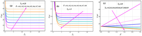 Graphs of the mean and variance of TC-MAM () for a variety of parameter values that can be identified in Figure 3 and Figure 4. The mean of TC-MAM (), shows a monotonically decreasing behavior for fixed value of and and varying values of (see Figure 3a). The escalating changes of mixing parameter enhanced the mean concentration, according to this analysis. We draw mean graphs (see Figure 3b) to demonstrate the behavior of the mean for fixed values of and and varying values of . It reveals the characteristics of component parameter in relation to a mean profile. The boosting attitude of reduce the concentration of mean for the all varying values of . The significances of the mixing parameter versus the mean profile are defined in Figure 3c for various levels of . From these drawn lines, it can be deduced that the concentration of the mean profile is a deteriorating function for parameter . The variance exhibits the same behavior as the mean in all scenarios (see Figure 4a–c).