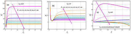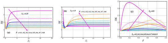 To expose the behavior of and for fixed value of and and varying values of (see Figure 6b and Figure 7b). The escalating changes of mixing parameter enhanced and concentration, according to this analysis. The significances of the mixing parameter versus the coefficient of skewness and kurtosis profile are defined in Figure 6c and Figure 7c for various levels of . From these drawn lines, it can be deduced that the concentration of the skewness and kurtosis profile is a deteriorating function for parameter .
