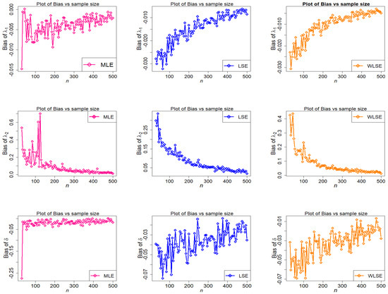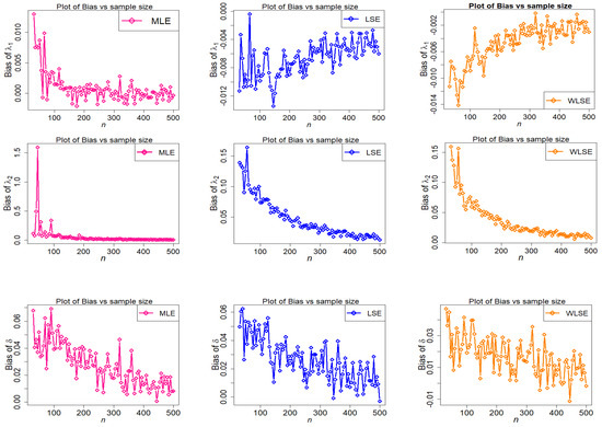The final conclusion drawn from the foregoing figures is that, as n rises, estimated bias and MSE graphs for estimators , , and finally approach zero for all estimating methods. This demonstrates the accuracy of both the estimating methods and the numerical computations for the TC-MAM parameters.