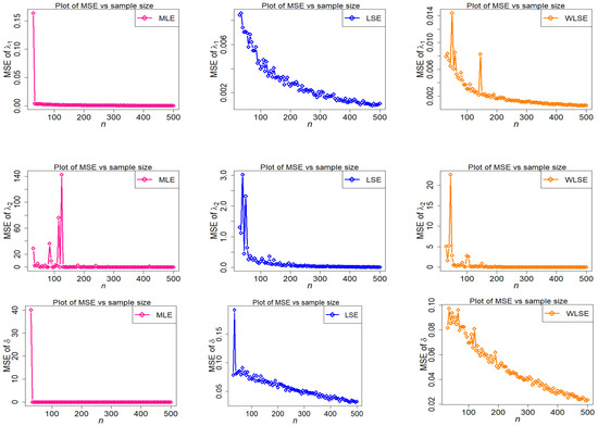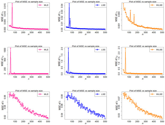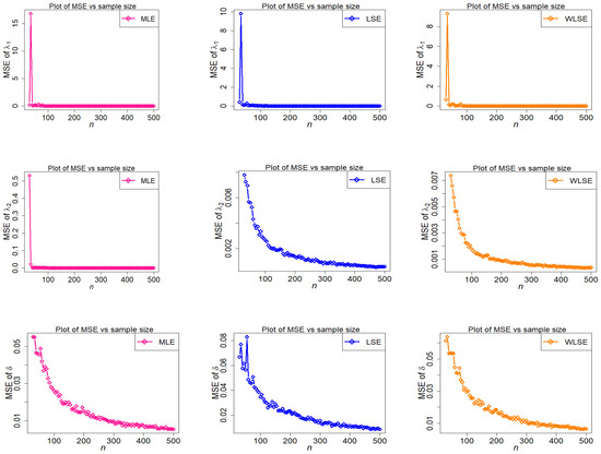 - The MSE of is strongly stimulated and higher under MLE and LSE estimation methods when (see Figure 10).