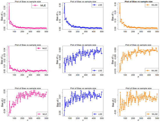 - The estimators of are over-estimated in the third scenario, however the over and under estimation of and are seen among the three investigated estimators, and the WLSE always has the minimum value of bias of all estimators (see Figure 13).