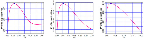 Dataset: There are 56 observations in this dataset pertaining to the burning velocity of various chemical substances. The laminar flame speed at the specified composition, temperature, and pressure circumstances is the burning speed/velocity. It lowers as the inhibitor concentration rises, and it may be observed directly by analysing the pressure distribution in the spherical vessel and monitoring the flame propagation. We consider a real-life dataset which represents the burning velocity (cm/s) of several chemical compounds to show the TC-MAM distribution’s suitability. This dataset is extracted from https://www.cheresources.com/mists.pdf (accessed on 4 September 2022) and the data are as follows: 68, 61, 64, 55, 51, 68, 44, 50, 82, 60, 89, 61, 54, 166, 66, 50, 87, 48, 42, 58, 46, 67, 46, 46, 44, 48, 56, 47, 54, 47, 89, 38, 108, 46, 40, 44, 312, 41, 31, 40, 41, 40, 56, 45, 43, 46, 46, 46, 46, 52, 58, 82, 71, 48, 39, and 41 [24,25,26,27] contains further data applications. The MLEs for the TC-MAM and GoF measures are shown in Table 1. The TC-MAM clearly outperforms the 2-CMSM, 2-CMEM, and 2-CMLM, as shown in Table 1. The profiles of the log-likelihood function (PLLF) based on the dataset that confirm the conclusions of Table 1 are shown in Figure 15. Figure 15 and Figure 16 show a graphical illustration of MLE existence and uniqueness, respectively. To summarize, the TC-MAM emerges as the better model for the dataset, indicating its usefulness in a real-world setting. We can deduce from this graphical representation and results obtain from Table 1 that the TC-MAM is a better fit for the dataset in consideration.