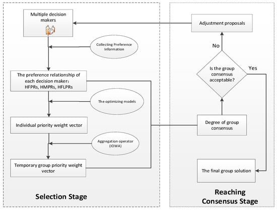 It is assumed decision-makers may use HFPR, HMPR, and HFLPR to express their preference information for the alternatives respectively, indicated by , , and . In addition, indicates weight vector of group for alternatives . There are two processes to go through before the final solution is reached: the selection phase and the consensus reaching process.