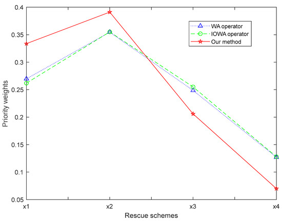 The aggregation operator is also a common tool to obtain the decision results in GDM. For the initial priority weight vector , and , we carry out weighted averaging (WA) operator and IOWA operator to aggregate ,, , and then obtain the group priority weight vector of alternatives, shown in Table 4 and Figure 2. It can be easily found that the ranking results of alternatives are the same, but the priority weight vectors are different for the three methods. The priority weights obtained by the first two methods based on operator aggregations are relatively close, which are quite different with the weight values obtained by the proposed method based on consensus achievement. By implementing consensus reaching process, the decision results are more acceptable to most decision makers. Therefore, the proposed model is more scientific.