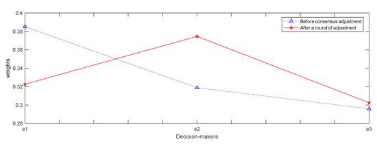 In this section, we mainly discuss comparative analysis with the most relevant studies [34,35]. The specific comparison results are shown in Table 5. It can be seen that the two studies [34,35] can only deal with the GDM problems for numerical type-based HHPRs but cannot deal with the GDM problems for HHPRs including the linguistic-based hesitation preference relations. The proposed model can not only deal with group decision making problems involving HHPRs including linguistic-based hesitate preference relations, but also establish an interactive consensus-building process, making the decision results more acceptable to most decision makers. In the proposed interactive strategy, experts can truly see that the pre-defined consensus level is gradually achieved through their own adjustment, which makes the decision result more acceptable to experts, and therefore more convincing than the decision result obtained with a method [34]. In addition, this paper proposed a method to dynamically adjust the weights of decision experts. According to the information quality of decision experts after adjustment, the new weights of experts can be determined. The dynamic adjustment of decision makers’ weights is displayed in Figure 3. From the Figure 3, it can be seen that weights of decision makers have changed over adjustment of preferences. However, the weight values of the decision makers do not change during the decision-making process in the relevant studies [34,35], so it cannot dynamically reflect the quality of preference information provided by the decision makers.