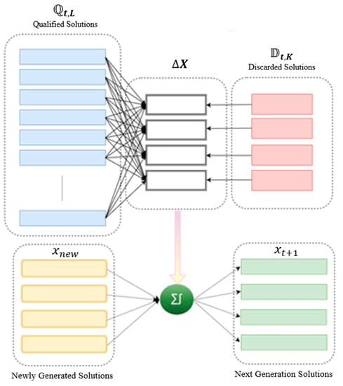 The new solution is generated using the extracted information from abandoned solutions, as follows: