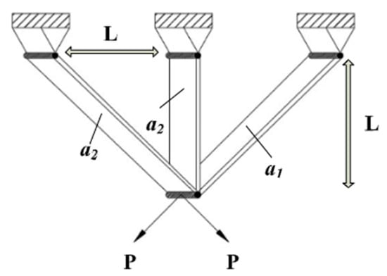 The balance in load with a three-bar truss in terms of volume was mathematically modelled as an engineering design problem with different constraints, such as stress, deflection, and buckling. In this engineering design problem, there are two design variables that are to be optimized, namely and . The three-bar truss design model is depicted in Figure 3. The objective function for this model was mathematically formulated as follows: