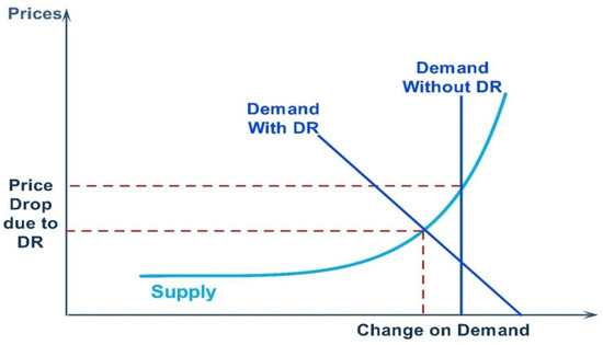 For an efficient operation, the supply and demand in the electricity system must be perfectly synchronised in real time. However, this is not always the case because of the complexity of the system and the fact that supply and demand levels frequently change because of a variety of factors, such as the failure of a generation unit, a transmission or distribution line, or a sudden change in load. DR is one of the least expensive resources available for the system’s best operation because the infrastructure of the power system is substantially capital accelerated [3]. The decrease in price volatility in the wholesale market is another significant market gain. As illustrated in Figure 1, a slight decrease in demand would cause a significant decrease in the cost of production and the price of power in real time.