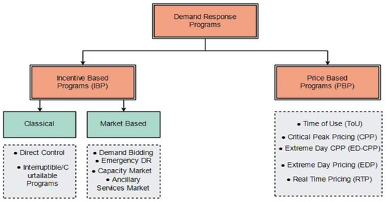 Various DR applications are displayed in Figure 2. Incentive-based programmes (IBP) and price-based programmes (PBP) are the two basic types into which DR programmes can be categorised [3,8]. IBP can also be broken down into two categories: traditional and market based. Direct load control (DLC) and interruptible or curtailable services (I/Cs) are examples of traditional applications. Emergency disaster relief initiatives (EDRP), demand bidding (DB), capacity market programmes (CMP), and ancillary services market programmes are the four categories for market-based programmes (ASMP).