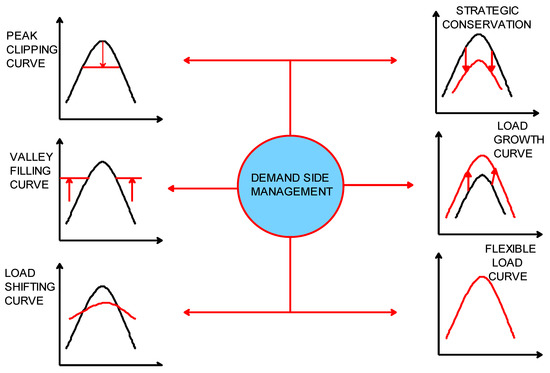 To produce the desired changes in the load contour at the distribution side, DSM modifies the power consumption. DSM focuses [18] on energy-saving techniques, electricity tariffs, financial incentives, and user- and environmentally friendly government policies to prevent the peak demand. Due to an increase in electricity demand, the system becomes unstable. To prevent these instabilities, demand side management has established a worthy objective that could be used to change the load curve’s configuration by reducing and shifting the total load demand at the distribution side during peak load periods to lower the electricity’s final tariff. Peak clipping, load shifting, valley filling, load growth, strategic conservation, and the flexible load curve are six broad techniques that can be used to alter the load configurations that depict the daily electric demands of residential, commercial, and industrial consumers between peak and off-peak times [18,19]. Figure 4 depicts these six demand side management topologies. To reduce the fear of smart grid insecurity, peak clipping and valley filling strategies focused on levelling the peak and valley load levels. Direct load control (DLC) is a technique used in the peak clip approach [18,19]. Load shifting, which involves moving loads from peak consumption times to off-peak consumption times, is a load management approach that is successfully used throughout the world [18,19]. To achieve load shape optimization, strategic conservation [18] seeks to directly deploy demand curtailment techniques at client residences. Strategic load expansion [18,19] is employed in cases of high demand to optimise the daily response, and it roughly equates to the valley fill strategy. Flexible load shape is primarily related to the dependability of the smart grid [18,19].