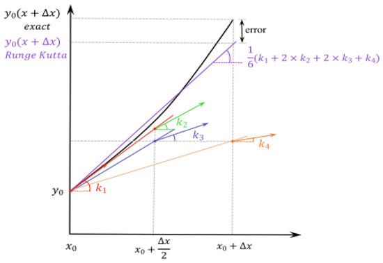 The fourth order RUNge Kutta (RK4) [44] was employed in this work to construct the suggested optimization approach. The RK4 method’s formula, which is based on the weighted average of four increments (as depicted in Figure 5) is as follows: