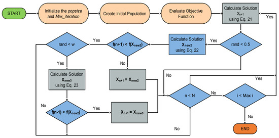 Overall, finding promising regions and progressing toward the overall best solution are greatly aided by the best solution . Therefore, in this study, the best solution is given more weight during the optimization process by using a random parameter . To specify in Equation (13), use the formulas: