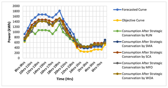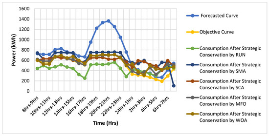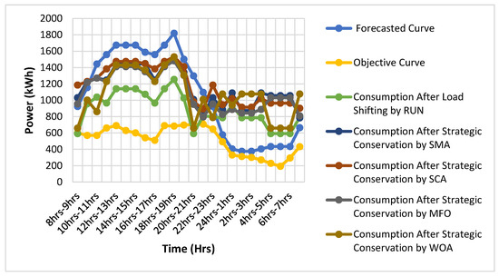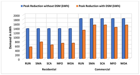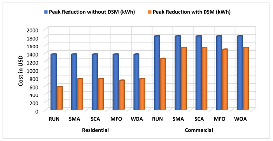 Figure 8 depicted the simulation curves of the commercial area acquired from the strategic conservation technique. Table 4 shows the comparison of the operational cost reduction and peak demand reduction in both areas. Several benefits provided when the effective path is selected for the DSM. The reduction in peak demand is the one of the examples of it. For the residential area, the peak reduction using the SMA, SCA, MFO, and WOA is given by 44.67%, 54.42%, 48.87%, and 48.53%, respectively. Here, the RUN proved its efficacy over the SMA, SCA, MFO, and WOA by giving 61.16% in peak reduction.