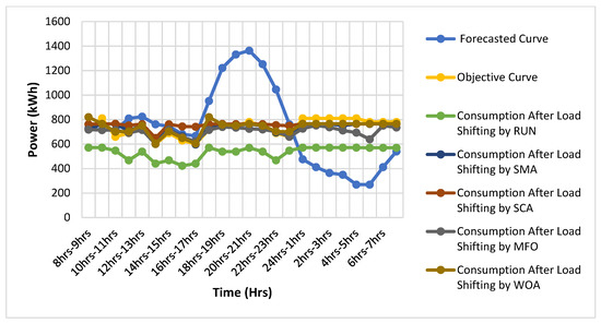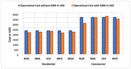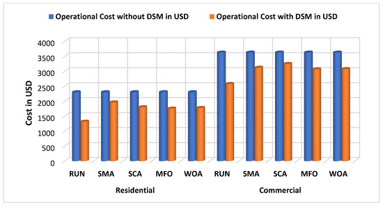 Figure 11 shows the results for residential consumers by using load shifting. Table 5 encountered the reductions in the operational cost for residential consumers by using the SMA, SCA, MFO, and WOA which is given by 6.26%, 2.36%, 9.40%, and 6.05%, respectively. The RUN proved its iron among other optimization algorithms by giving a reduction in cost by 8.41%. For commercial consumers, a reduction in operational cost by using the SMA, SCA, MFO, and WOA is given by 0.72%, −2.72%, 4.43%, and 6.76%, respectively. The RUN proved its iron over the SMA, SCA, MFO, and WOA by giving a reduction in cost by 16.45%.