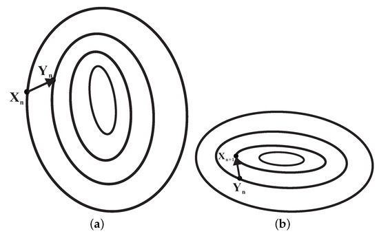 The whole graphic demonstration of Algorithm 3. (a) Newton’s gradient descent method unrelated to the test point of the first formula in Equation (15); (b) Newton’s gradient descent method associated with the test point of the second formula in Equation (15); All the curves of figures (a,b) denote contour surfaces and not contour curves.