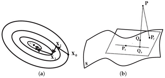The complete schematic of Algorithm 1. (a) Newton’s gradient descent method; (b) Point orthogonal projection onto algebraic surface. All the curves of figures (a) denote contour surfaces and not contour curves.