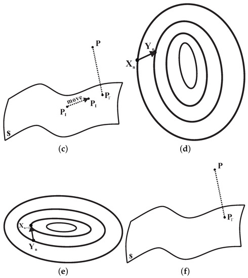 Now, running Equation (14) and Algorithm 1 repeatedly, the iterative point can converge and move to the close position of the orthogonal projection point . The detailed description can be expressed as Algorithm 2 (see Figure 3b).