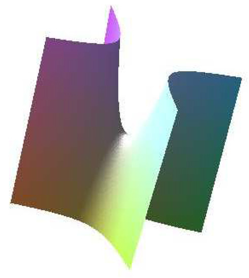Now, we consider a self-intersecting quasi-algebraic surface , where (see Figure 9). Since the surface is not a complete algebraic surface in the true sense, some parts of the surface are singular regions, which may not converge for Algorithm 4, but for non-singular regions, Algorithm 4 can still converge. In the specified region, we arbitrarily choose two different 3D test points. The implementation requirements and environment are exactly the same as those of Examples 1 and 2. The corresponding orthogonal projection point for each test point was computed using Algorithm 4. The concrete computed values are displayed in Table 3, and the digital values of the orthogonal projective point we present are abbreviated. From Table 3, the probability of convergence using Algorithm 4 with these test points is high, which is detected to be a sign of robustness and efficiency.