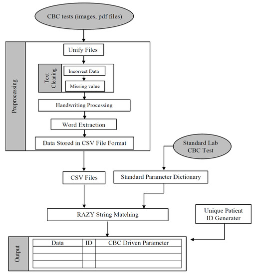 First, the reports were obtained from the laboratory as image or pdf files and then were automatically converted into the CSV file format. The reports were then pre-processed by removing the irrelevant text artifacts created by the OCR software and handling the handwriting cases and misspelled error cases that may result from the OCR software or others. The string matching algorithm enables the system to manage errors by matching words depending on the standard data items (stored in the standard dictionary). The data items are a string or number, and these items are used to denote a piece of information within a general patient record (e.g., the patient’s unique ID, age, sex, and other essential information in the CBC report, such as the WBC). Therefore, after implementing 12 different string matching algorithms, the best two algorithms based on implemented results were hybrids with a modified version of the Rabin–Karp algorithm to improve the processing time. However, first, the basic steps of the Rabin–Karp algorithm must be explained, as shown in Algorithm 1, where q’ is a prime number, and