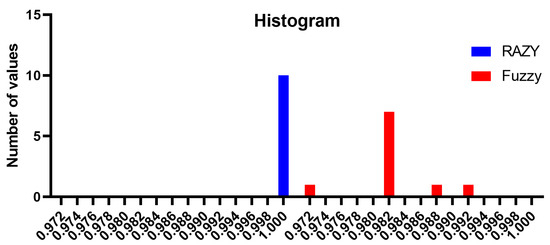 Figure 3. In this figure, the histogram of the accuracy using the proposed approach is shown in blue and is almost perfect without variations. However, the accuracy histogram of the Fuzzy approach varies and is lower in value than that of the proposed approach. These results emphasize the superiority and effectiveness of the proposed approach in text mining tasks.